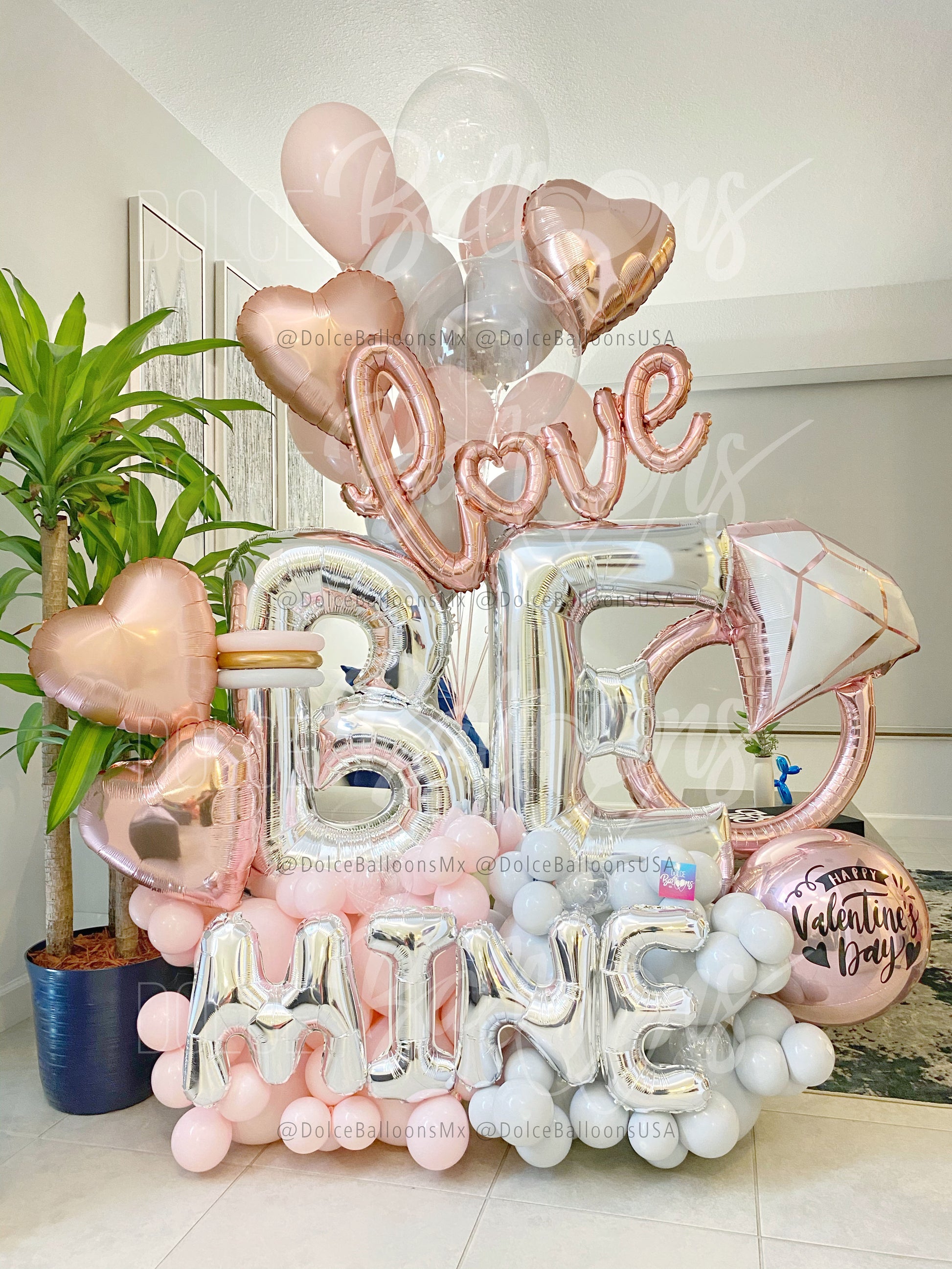 Creamos este Maxi Bouquet de Globos pensando en ese detalle más que único apantallador. La combinación de letras grandes y chicas, ese anillo de globo, múltiples corazones, burbujas flotantes y un infaltable globo con mensaje personalizado conforman este diseño listo para causar ese Efecto Wow característico de Dolce Balloons.