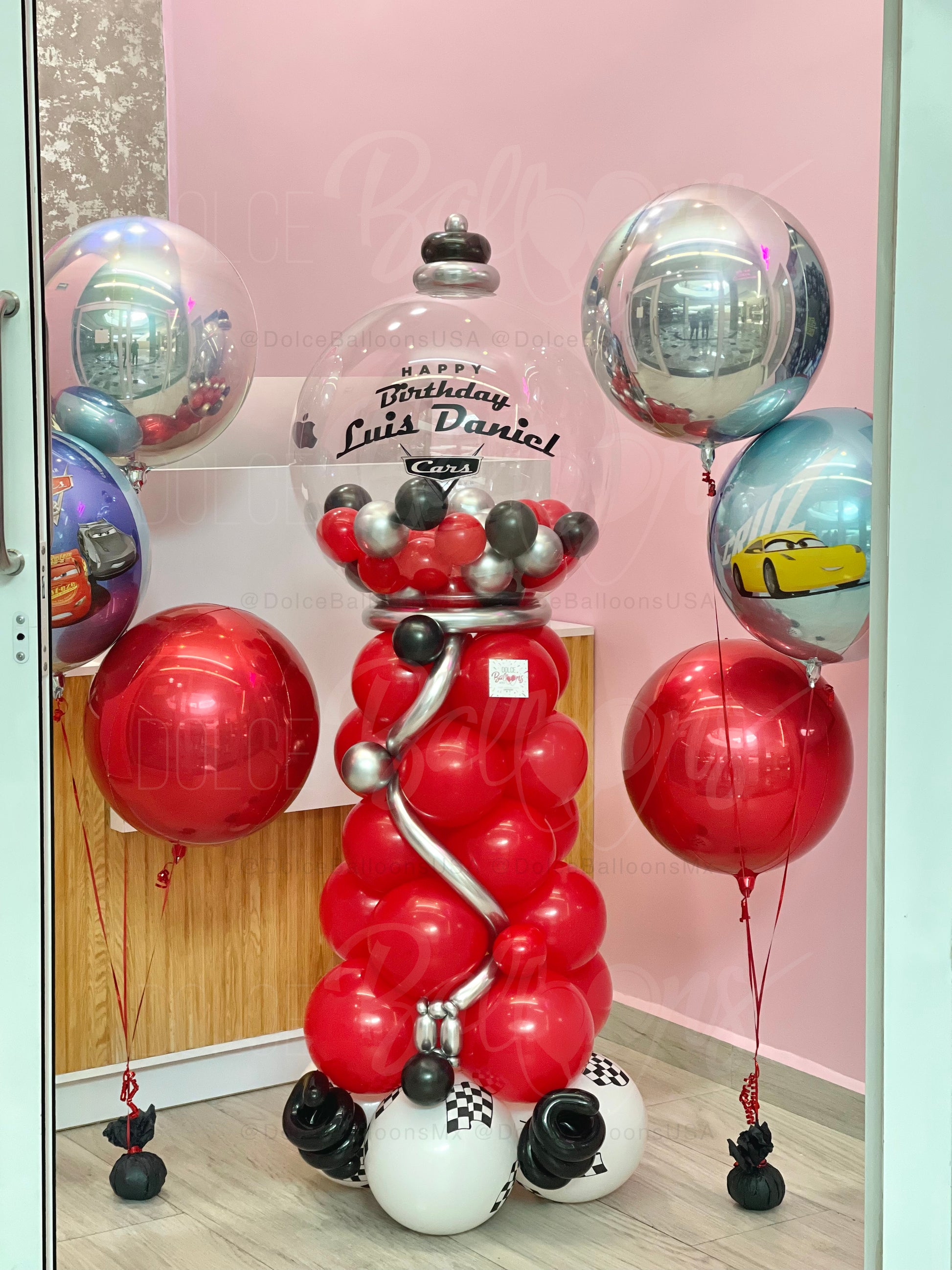 Peculiar y Original Máquina de Golosinas creada de globos y la helos acompañado con 2 mini bunches de globos esféricos.