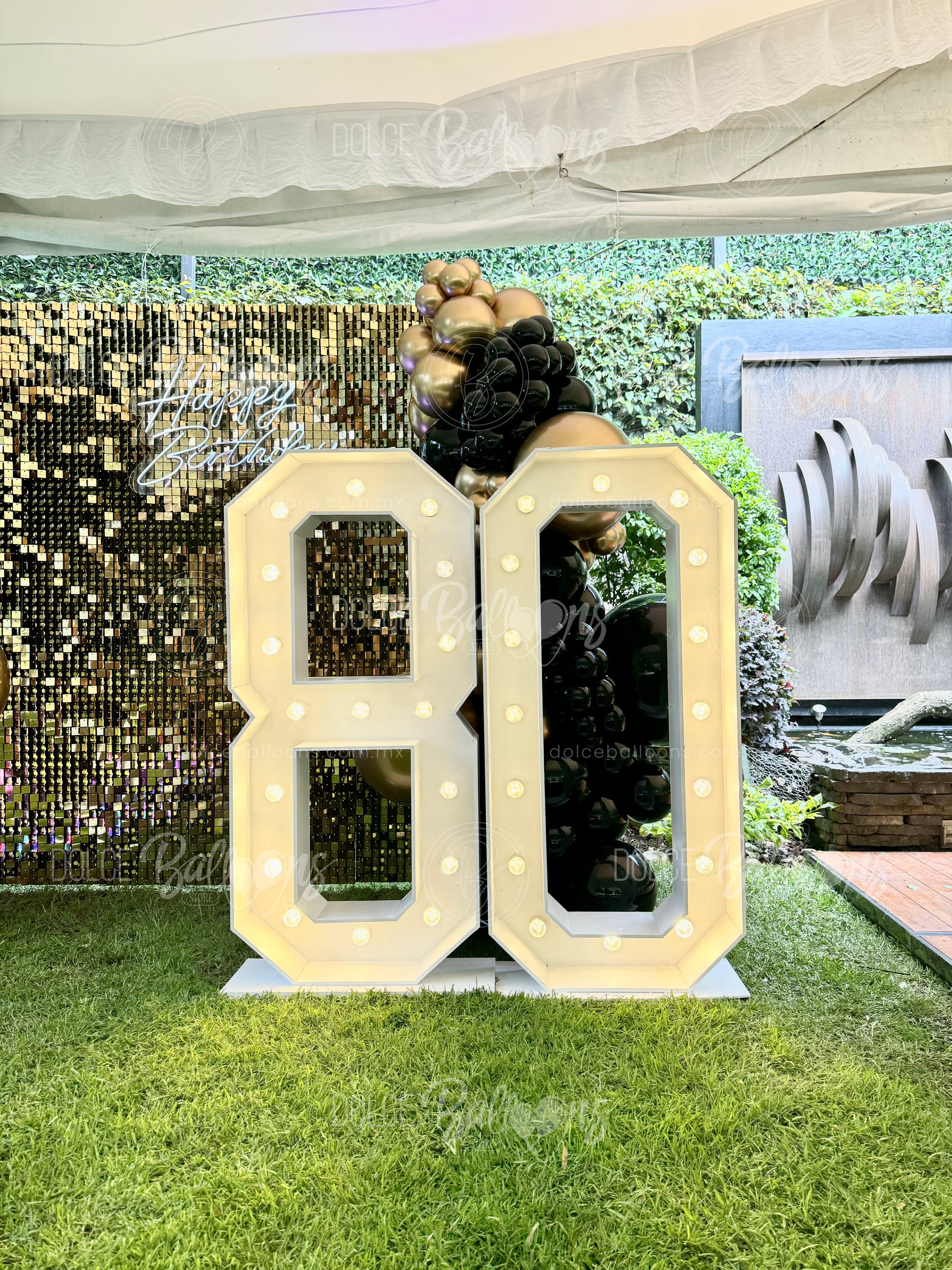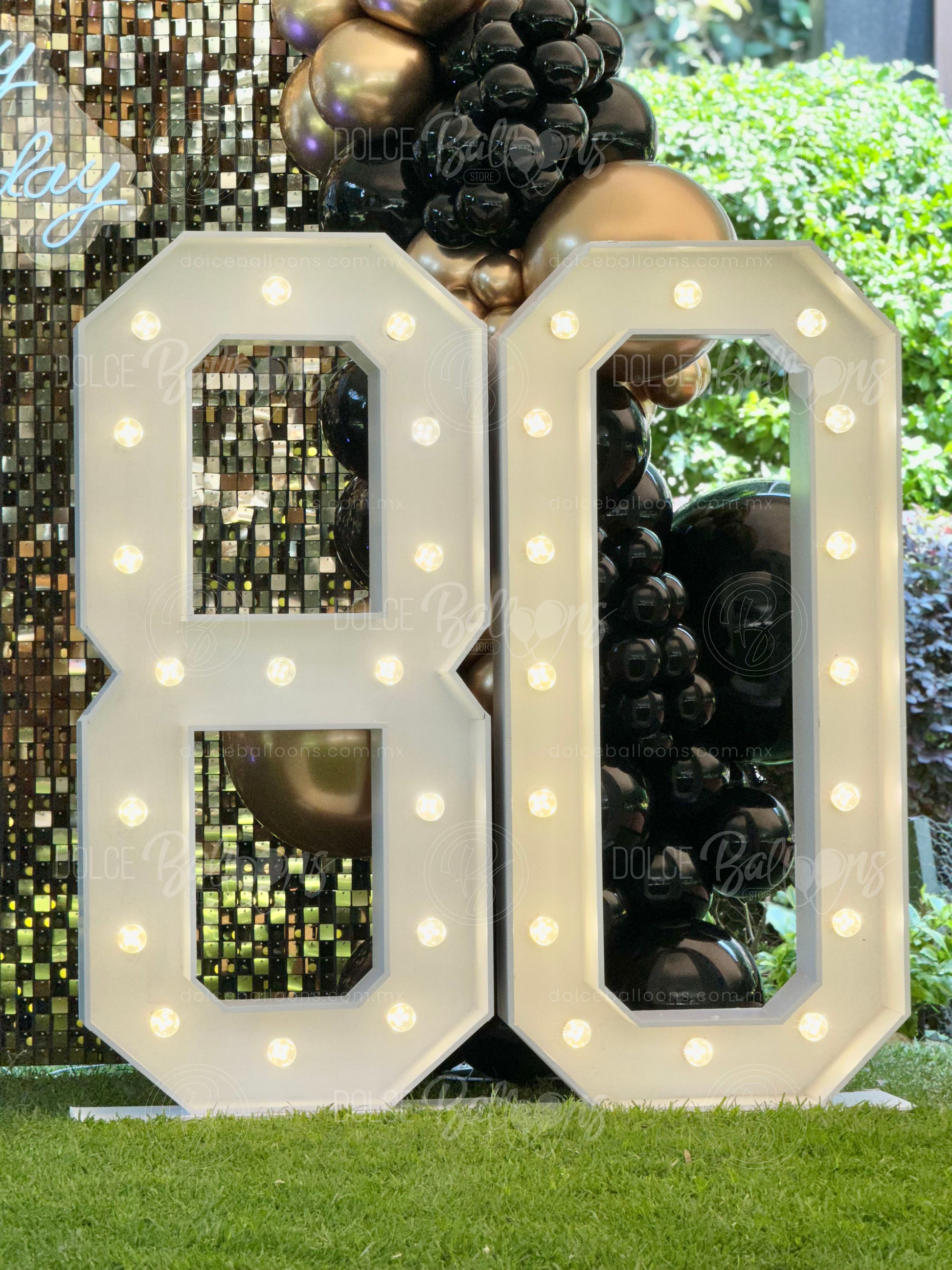 Nuestros Números y Letras estilo Broadway están elaborados en madera laqueados en blanco y con focos led de baja potencia. Miden 0.75 x 1.40 mts cada uno.