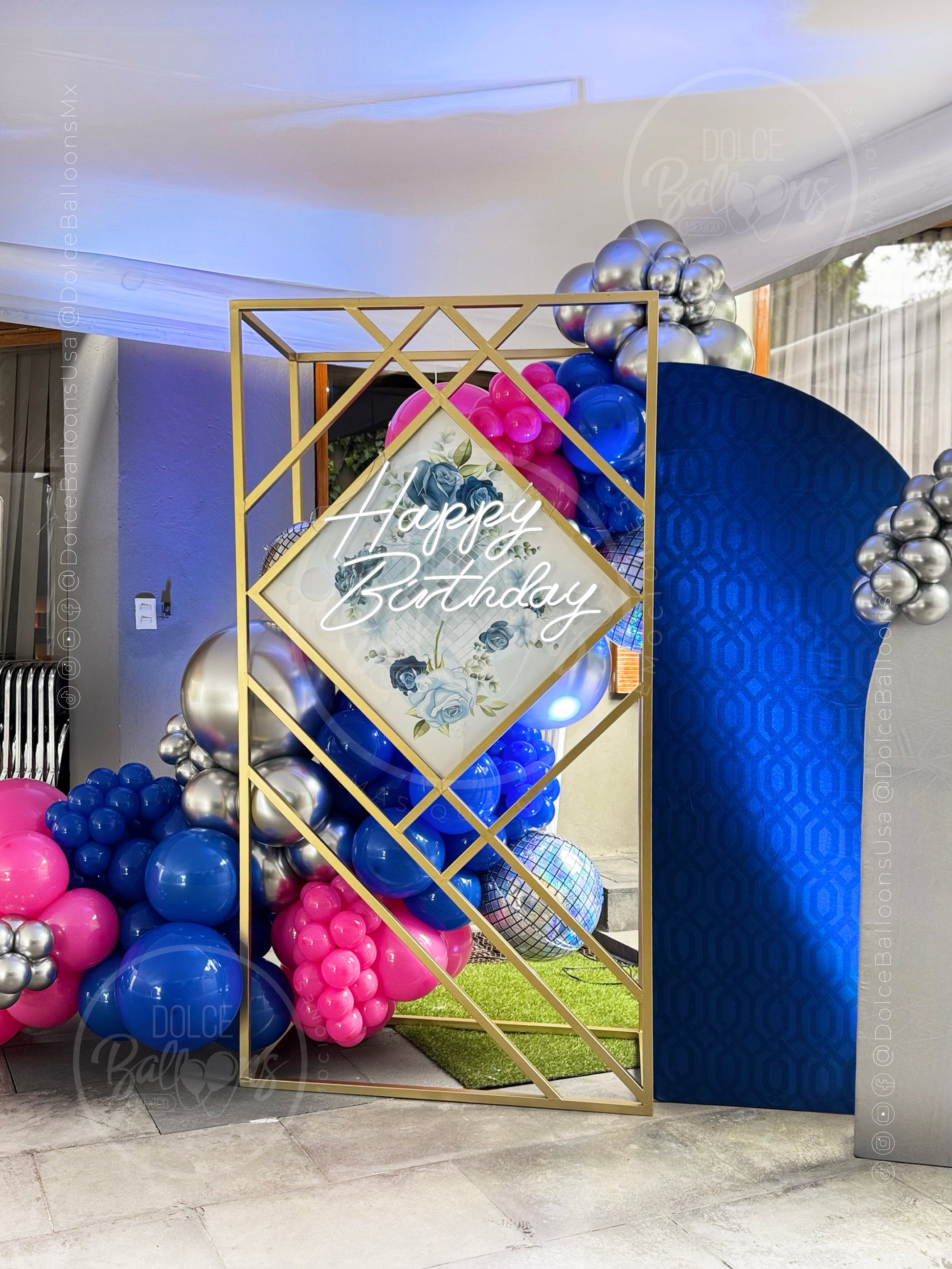 Este Set Decorativo cuenta con una estructura metálica, letrero neón y guirnalda de globos dentro y fuera de la estructura que aportan un aspecto único a este diseño.