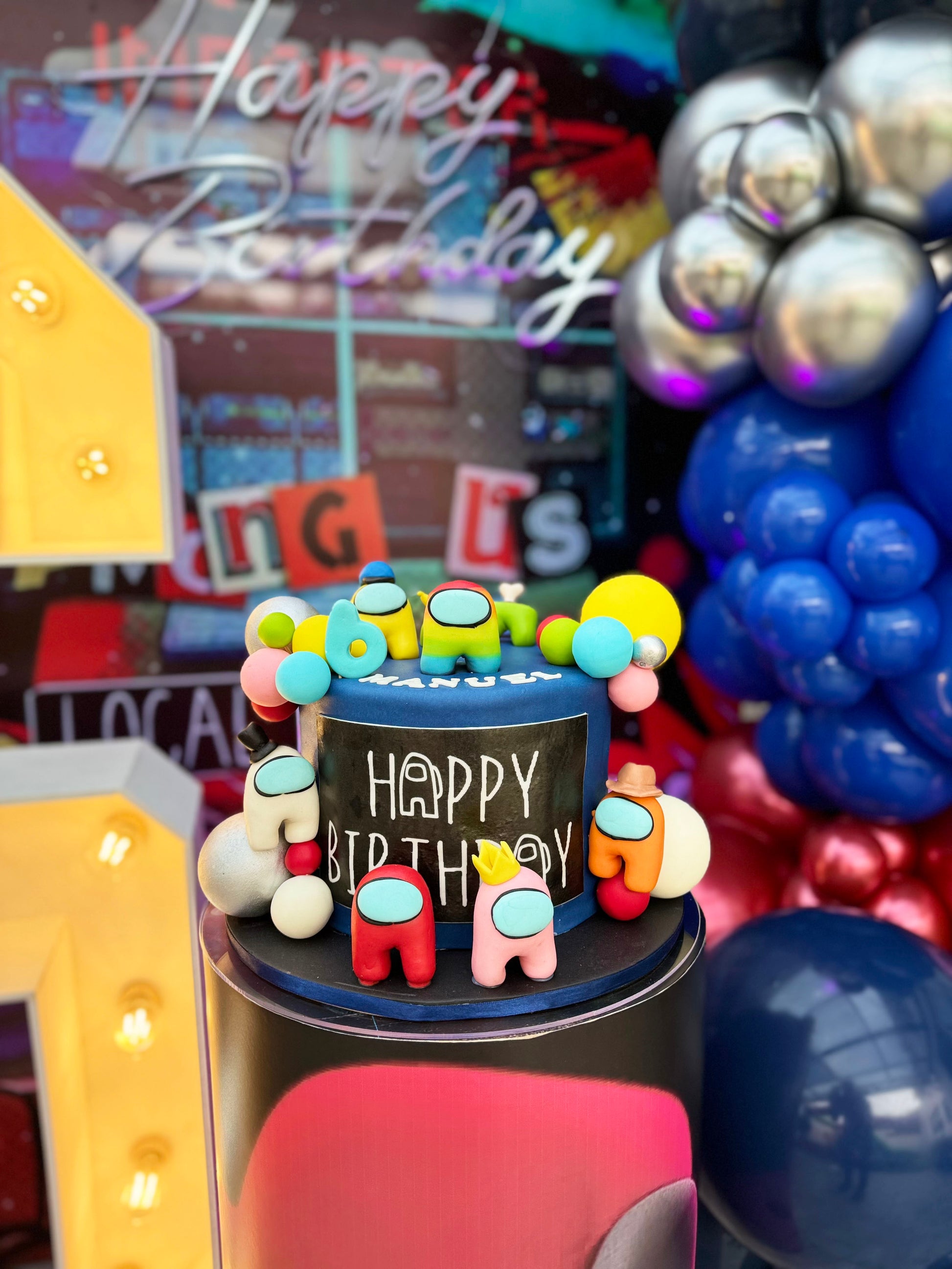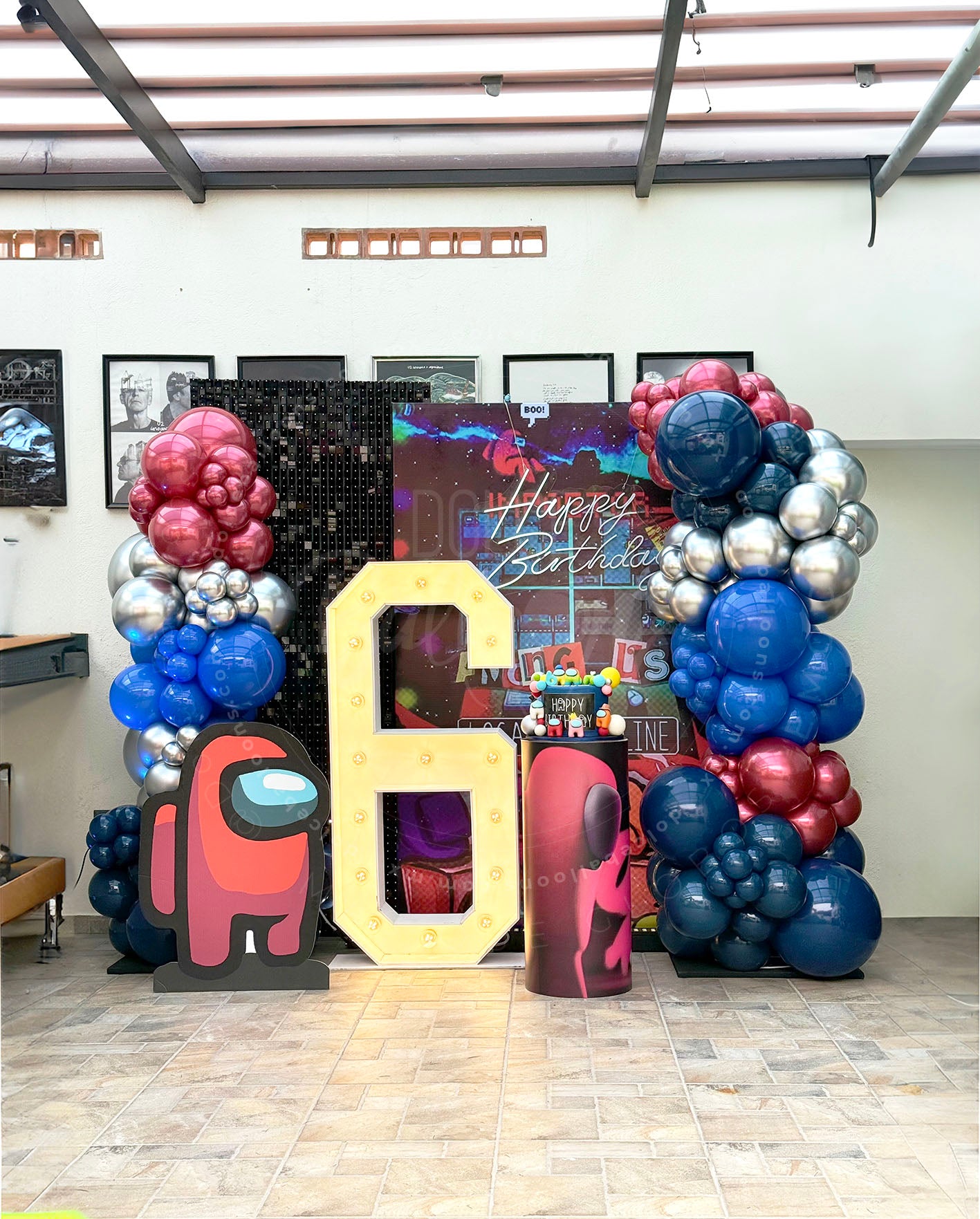 Diseño 100% Personalizado para este festejado que cumplió 6 años y le encanta Among Us, así que hicimos un muro mixto con Shimmer Negro y Mampara Impresa con la Temática a full color, en ellos colgamos el letrero neón de Happy Birthday y agregamos guirnaldas de globos de los lados.