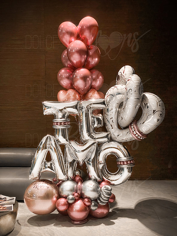 Nuestros Artistas Profesionales han creado un diseño increíble combinando las letras de TE AMO con 2 corazones entrelazados, complementado por un bunch de globos con helio y un globo con mensaje personalizado que le aporta ese estilo único que no puede faltar en los Bouquets de Globos de Dolce Balloons.